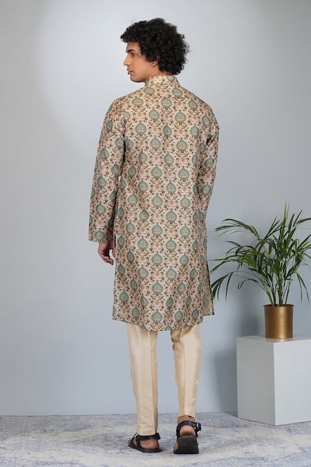 Beige kurta featuring Mughal Bagh print, stand collar & full sleeves. Paired with beige straight fit pant in cotton silk.