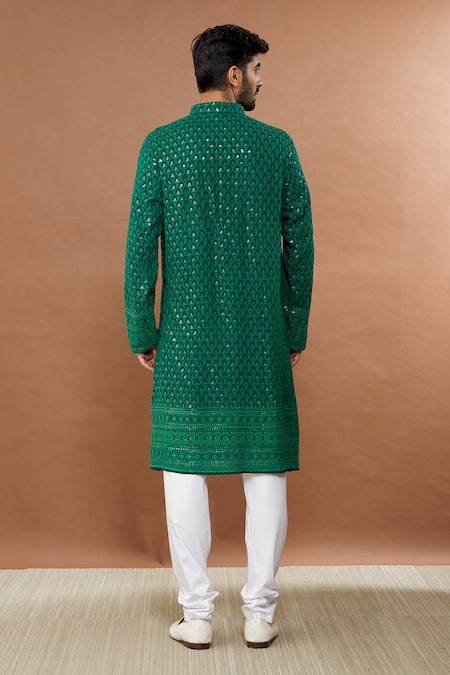 Green kurta featuring full sleeves and a mandarin neckline with floral embroidery enhanced by sequins. Paired with a white churidar for a complete look.