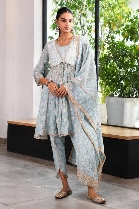 Blue short anarkali with overlap jacket panels, all over woven stripe pattern, floral cut work, zari, thread embroidery, sequin, gota & mirror work lace panels. Paired with metallic striped draped dhoti pant with cut work lace border details.