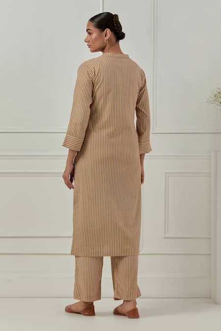 Mustard brown striped kurta featuring a mandarin collar and side slits. Paired with matching straight pants and an optional shawl.