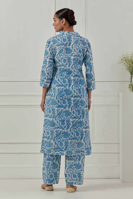 Blue Cotton, Silk Organza Split V-neck Floral Block Print Calla Kurta Set