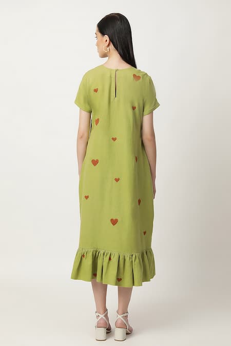 Grass green midi dress featuring heart embroidered motifs and a frilled hem