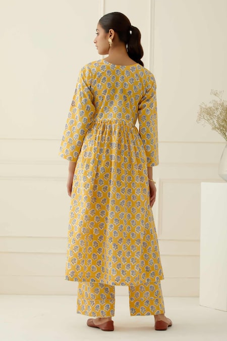 Yellow kurta featuring a printed design, V-neckline, and pleated details. Paired with matching pants and a coordinating dupatta.