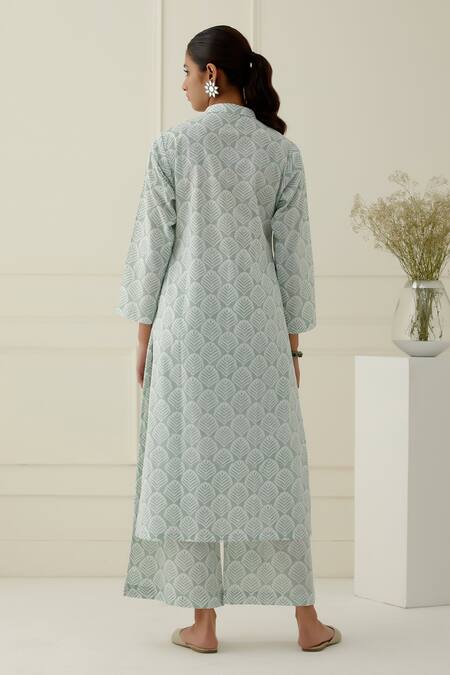 Green Cotton, Kota Doria Mandarin Collar Printed Sea Kurta Set