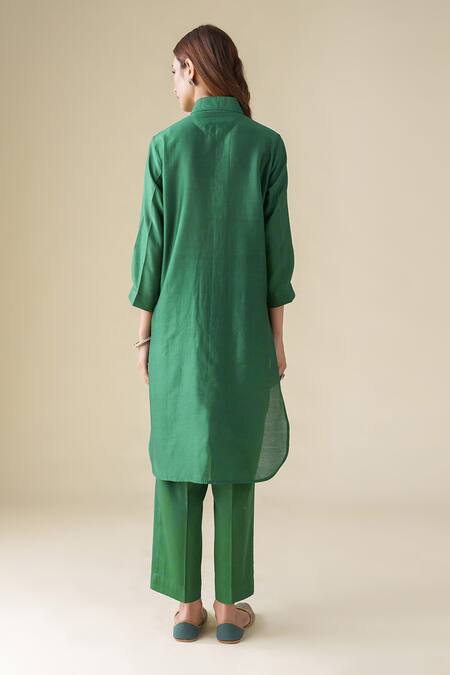 Green collared tunic featuring metal sequins on the placket. Paired with matching pants for a cohesive look.