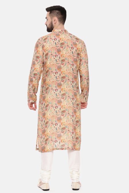 Pink kurta featuring full sleeves, stand collar, and concealed button placket. Paired with a churidar.