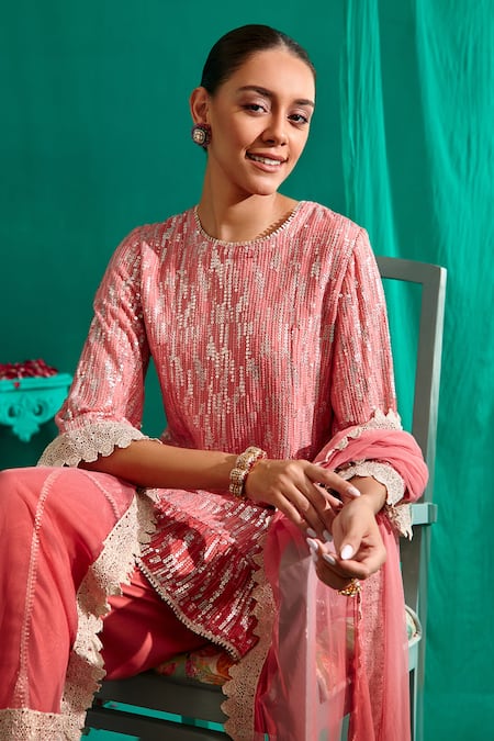 Rose pink asymmetric kurta featuring all over sequin work. Paired with a draped tulip pant and a dupatta with floral cutwork border.