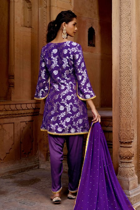 Purple Chanderi, Georgette, Satin Sequins, Banarasi Kurta And Tulip Pant Set