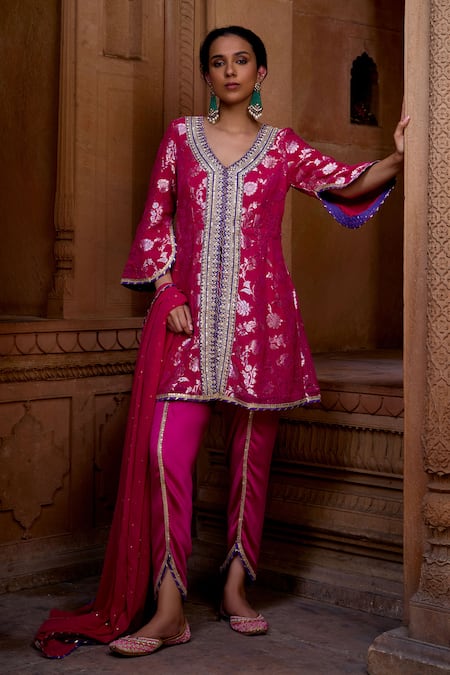 Pink banarasi georgette kurta featuring purple contrast embroidery on the placket and sleeves. Paired with a tulip pant and a matching dupatta.