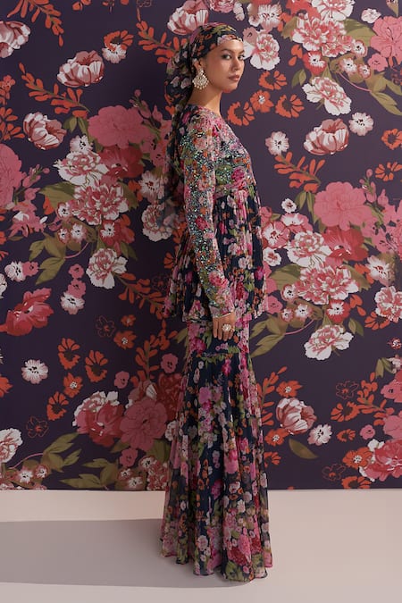 Blue floral kurta featuring long sleeves and a front zip closure. Paired with a matching sharara with flared legs.