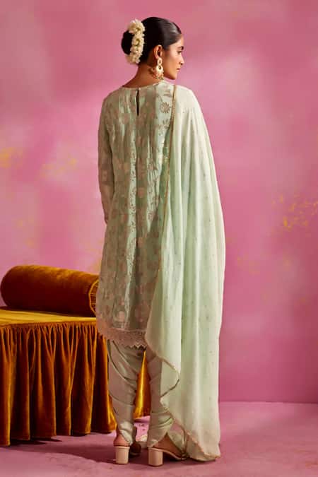 Pistachio satin kurta featuring floral woven pattern, lace embroidery, and a high-low design. Paired with a dhoti pant and sequins work dupatta.
