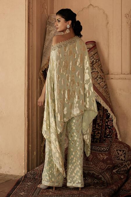 Mint green kaftan featuring floral embroidery along the drop down one-shoulder. Paired with wide-legged pants, both crafted from georgette with attached lining.