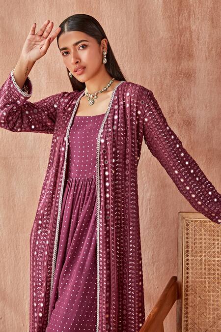 Purple jumpsuit featuring mukaish work and a scoop neckline. Paired with a long georgette jacket adorned with mirror and thread work.