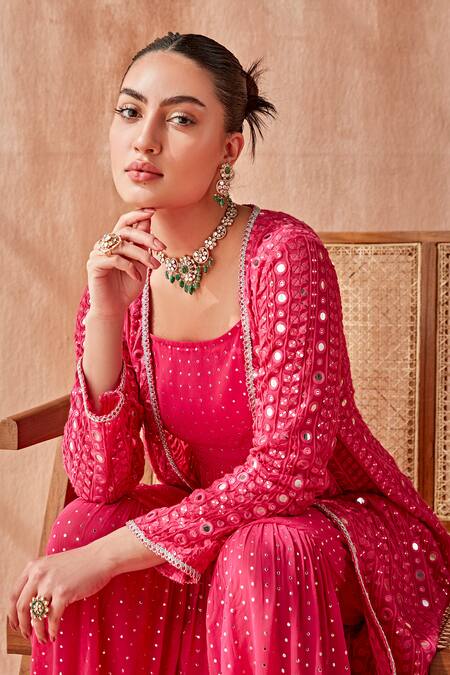 Pink jumpsuit featuring mukaish work and a relaxed fit. Paired with a long georgette jacket adorned with mirror and thread work.
