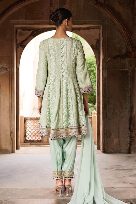 Green Georgette, Satin Embroidery, Sequins Panelled Anarkali Salwar Set
