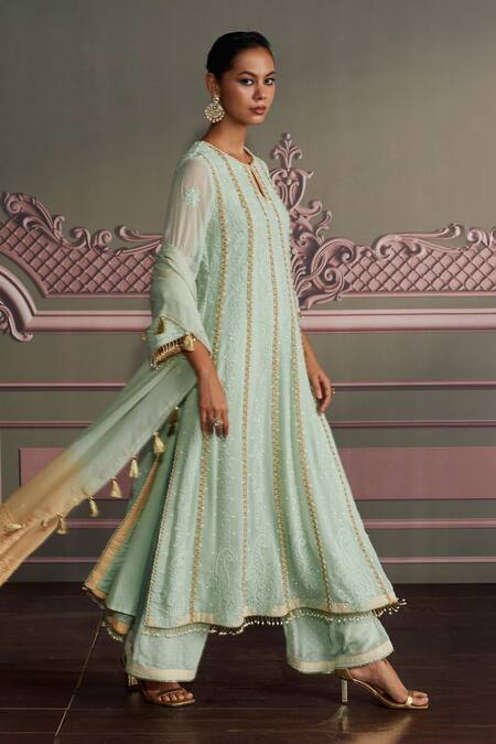 Mint Georgette Embroidery, Tassels Keyhole Neck Sage Green Kurta Set