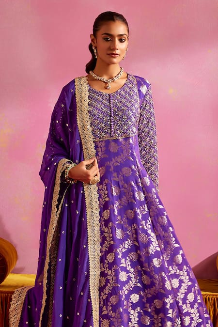 Purple banarasi anarkali featuring floral woven pattern and sequins embroidered yoke and sleeves. Paired with churidar and a mirror work dupatta.