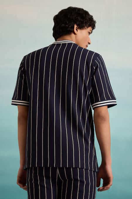 Navy blue shirt featuring vertical stripe prints and a mandarin collar