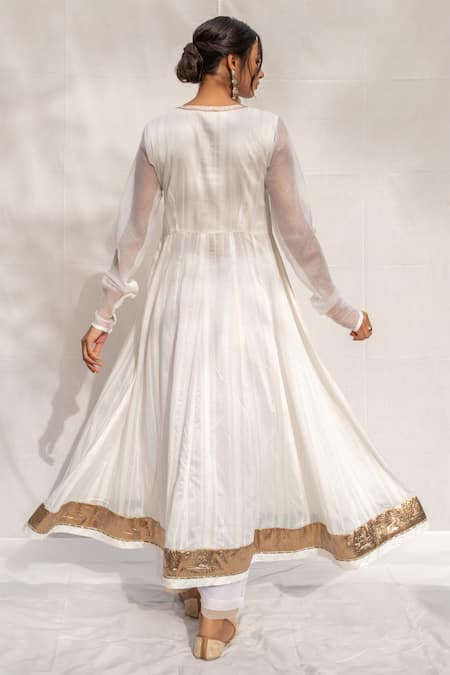 White Anarkali Chanderi Blend, Dupatta Kota Doriya, Pant Chandani Set