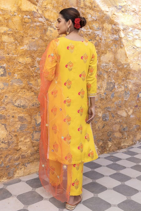 Yellow kurta featuring floral blossom patterns and sequin embroidery detail. Paired with matching pant and embroidered organza dupatta.
