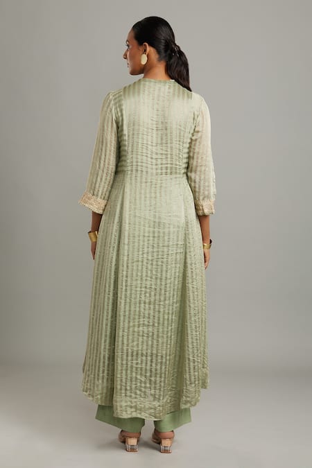 Green banarasi layered anarkali with stripe pattern, high-low hem, kathiawadi embroidered square yoke & sleeve cuffs. Paired with pants & bordered booti pattern dupatta.
