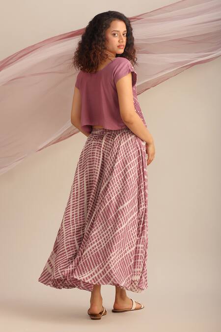 Lavender crop top featuring floral hand embroidery and cording details. Paired with a striped printed circular skirt.