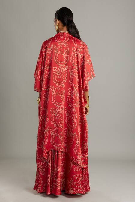Brick red bamberg satin lehenga with all over grey creeper plant, pleated detail & embroidered waistband. Paired with keyhole neck printed blouse with thread embroidery on neck yoke & cape with asymmetric hem.