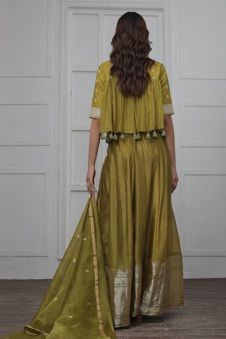 Green Silk, Brocade Embroidery, Tassels Round Neck Yoke Top Lehenga Set