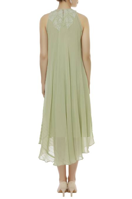Halter neck flared green dress with placement floral motif work. Comes with matching slip dress.
