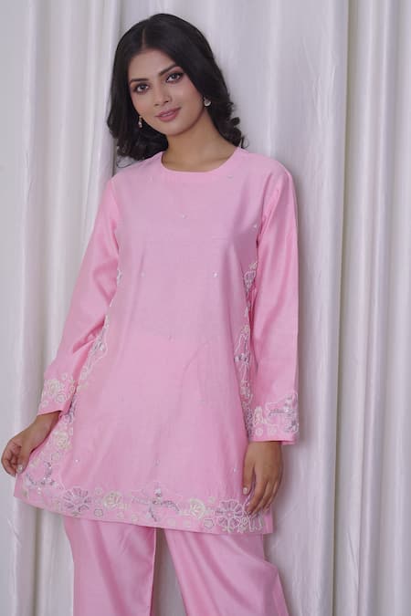 Pink kurta featuring hand embroidery with beads and sequins in floral motifs. Paired with coordinating pant for a complete look.