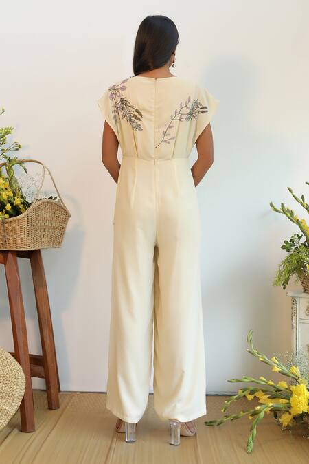 Cream jumpsuit with floral embroidery, round neckline & flared sleeves.