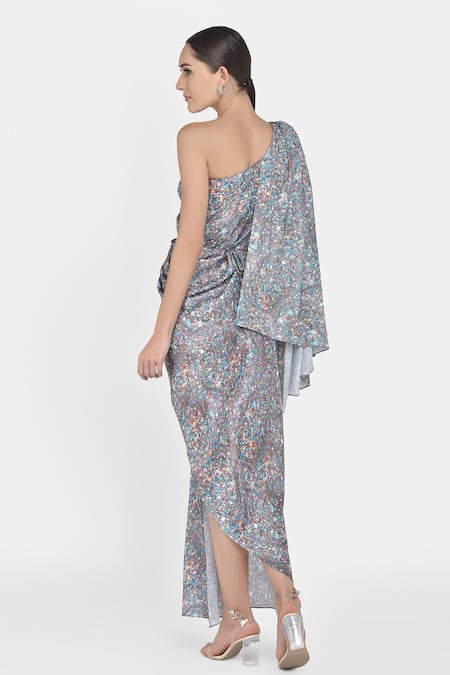 Grey Crepe Satin Geometric One Shoulder Printed Dress