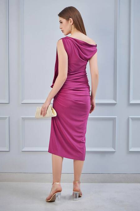 One side drape, Side slit, Gathered dress, Note:Clutch carried by the model is not for sale