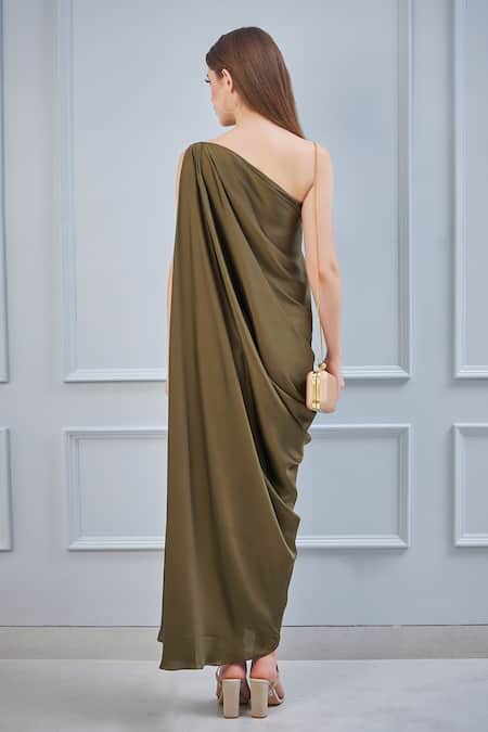 Moss green gown with cowl detail and slit in front. Comes with scarf.