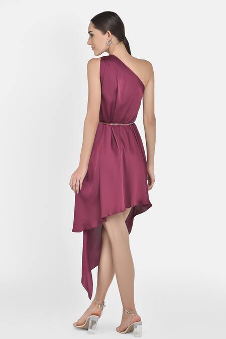 Wine dress with one-shoulder neckline & asymmetric hem. Comes with tie-up belt.