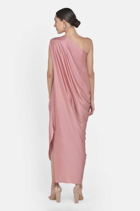 Dull pink draped dress with one-shoulder neckline, pleat-cowl detail & asymmetric hem.