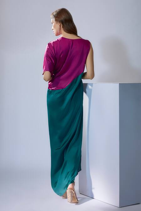 Purple and sea green color blocked gown featuring a boat neckline and asymmetric sleeves