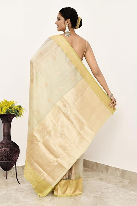 Yellow and grey colorblock saree featuring floral and tear drop woven motifs. Comes with a running blouse piece made of pure tissue fabric.