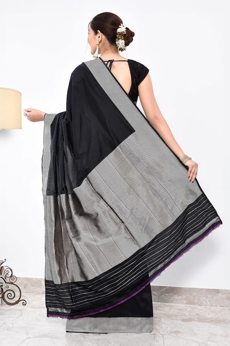 Black handwoven saree featuring a contrast woven zari border in a stripe pattern. Comes with a running blouse piece for a complete look.
