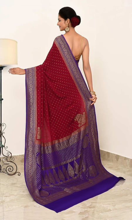 Maroon handloom cotton saree featuring all-over ditsy bloom booti woven detailing. Paired with a running blouse piece in contrasting blue floral design.