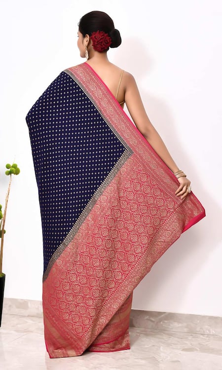 Contrast broad border with intricate zari work, Zari woven floral vine motifs, Handwoven pattern details