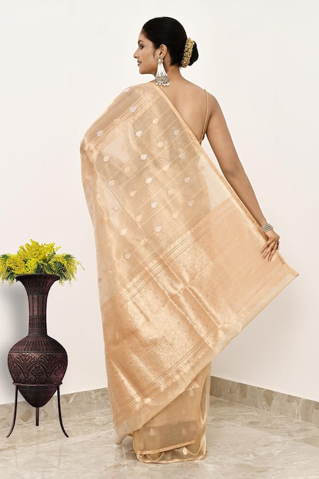 Gold saree featuring handwoven floral buti and tear drop motifs. Comes with a running blouse piece.
