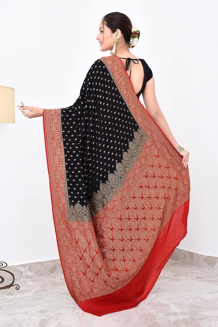 Black and red saree featuring a handwoven floral butti pattern with a running blouse piece. Made from crepe fabric, it offers a relaxed fit and is ideal for classic occasions.