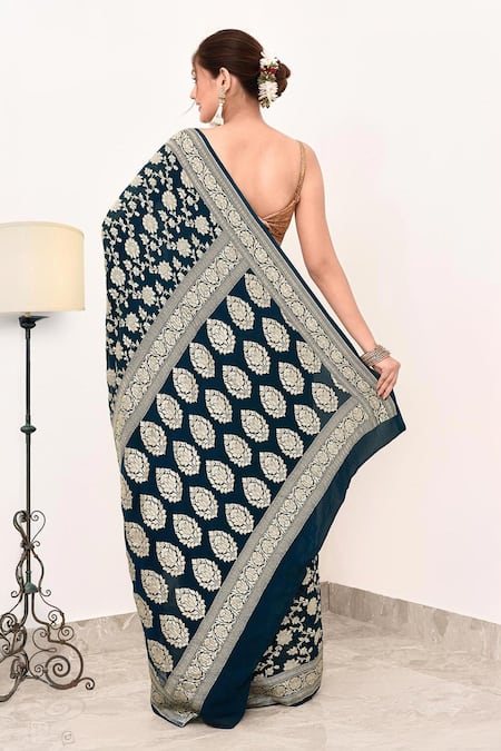 Teal blue saree featuring floral veil pattern with zari work
