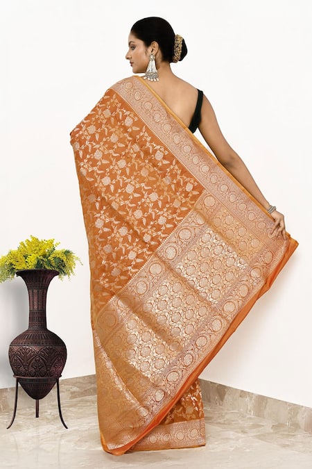 Gold and yellow saree featuring floral vine woven motifs. Accompanied by a running blouse piece.