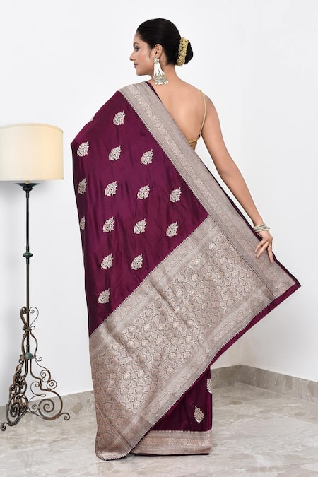 Wine handwoven Katan saree featuring floret pattern all over with metallic hem. Comes with a running blouse piece.
