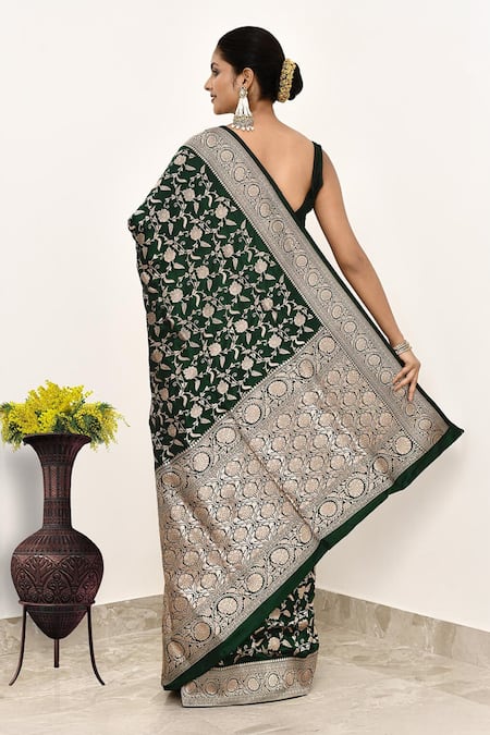 Green Silk, Kota Doria Flower Vine Woven Banarasi Saree With Running Blouse