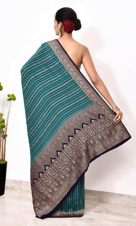Blue Handloom Cotton Foliage Stripe Woven Banarasi Saree With Running Blouse