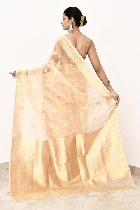 Gold saree featuring geometric woven motifs and a running blouse piece. The fabric is pure tissue, handwoven for a delicate finish.