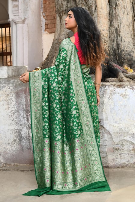 Buy_Naaritva India_Green Crepe, Silk Zari Handwoven Banarasi Saree With Running Blouse _Online_at_Aza_Fashions